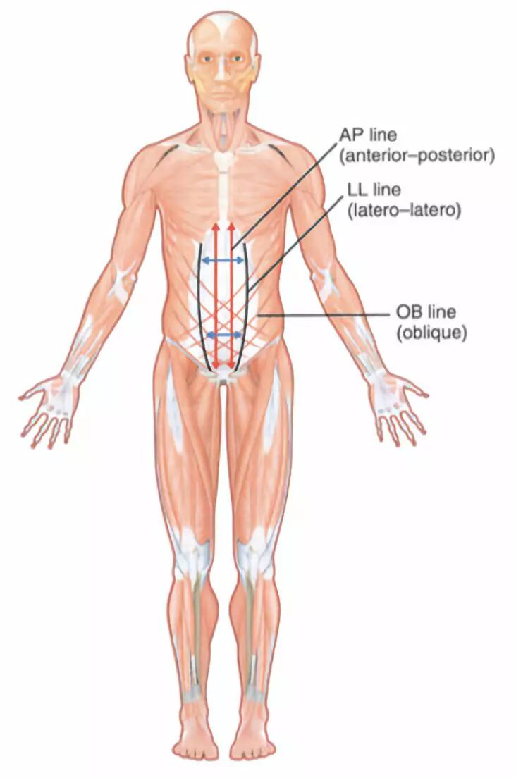 这些支撑张量分为纵向(AN-ME)、横向(AN-LA)和斜向(IR),在躯干通过胸、腰、骨盆张拉结构延续。